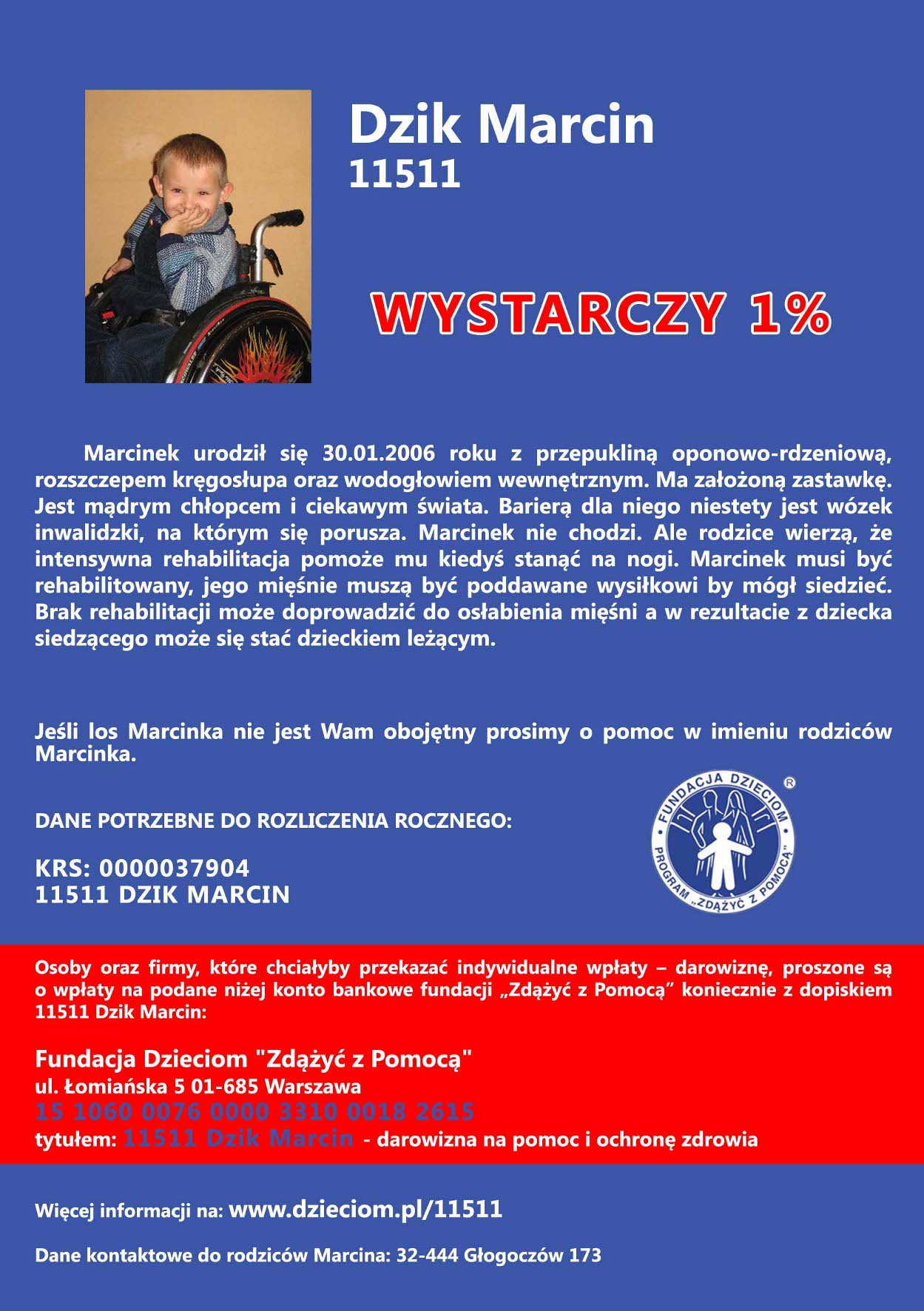 Marcinek urodził się 30.01.2006 roku z przepukliną oponowo-rdzeniową, rozszczepem kręgosłupa oraz wodogłowiem wewnętrznym. Ma założoną zastawkę. Jest mądrym i ciekawym świata chłopcem. Barierą dla niego jest niestety wózek inwalidzki na którym się porusza. Marcinek nie chodzi ale Rodzice wierzą, że intensywna rehabilitacja pomoże mu kiedyś stanąć na nogi.